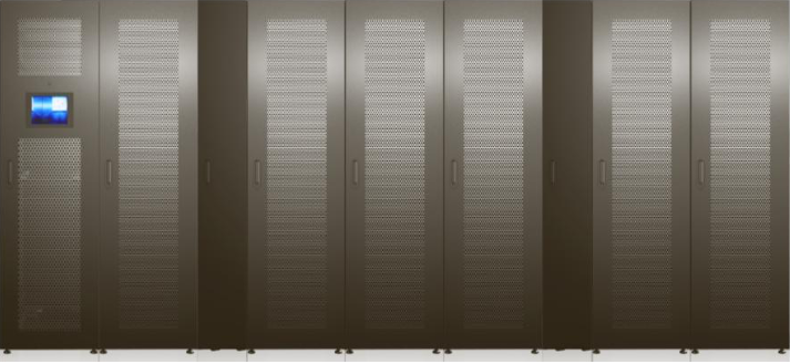 该方案采用封闭冷通道系统、PDU 垂直安装机柜两侧、机架式高频 UPS,当采用 1~3个 SR 系列机柜时采用 1 台行间精密空调或者安装 2 台 3.5~6.5KW 机架式空调,当采用 4~6 个 SR 系列机柜时采用 1 台 25KW 或者两台 12.5KW 行间精密空调,其中 SR 系列机 柜可定制电池架放置蓄电池组作为。收费站 6~8 机柜双排柜整体机房系统: